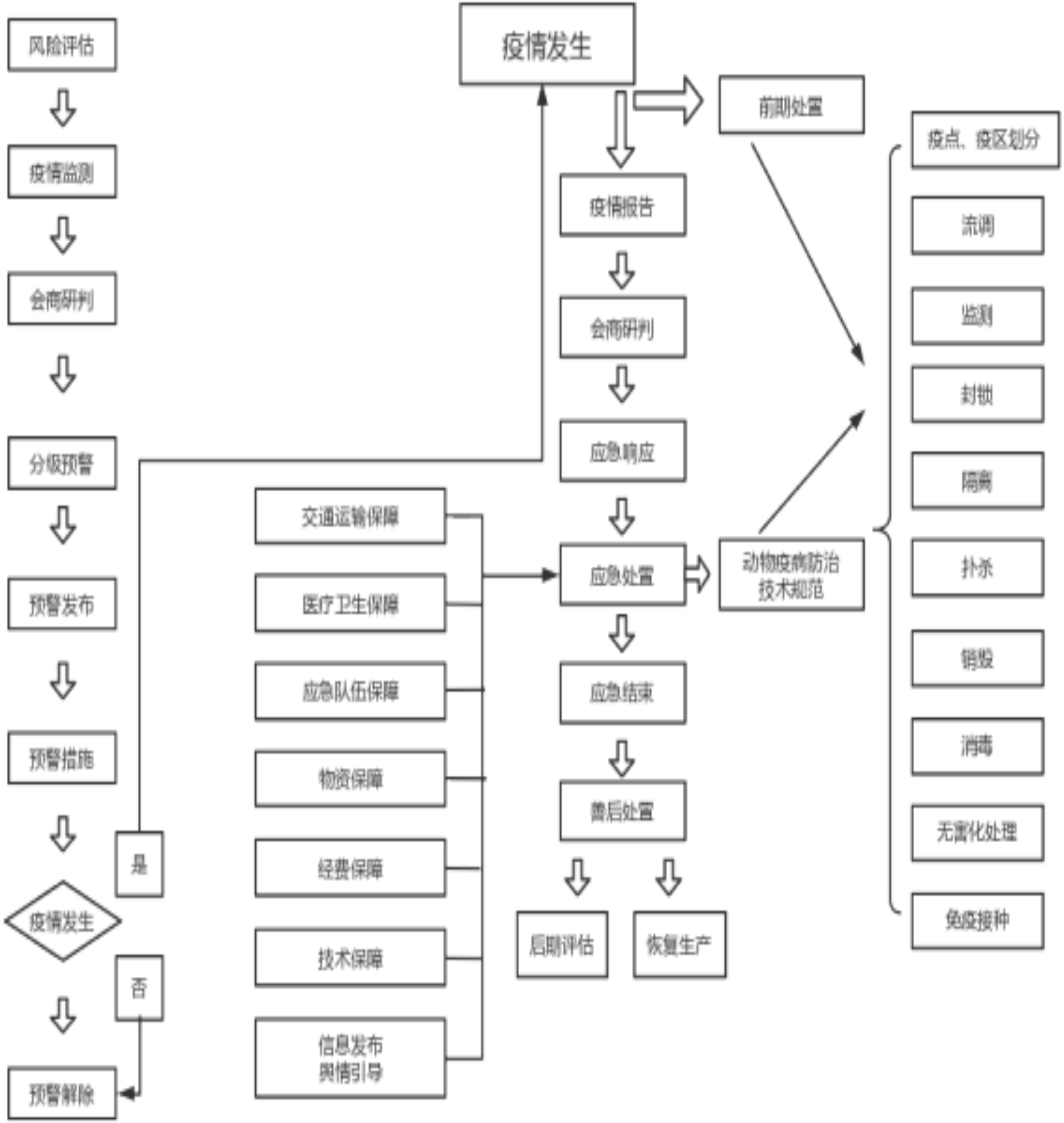在发生疑似疫情时,事发地进行前期处置,根据流行病学调查结果,分析疫源及其可能扩散流行风险等情况。在对疑似疫情报告的同时,对发病场户实施隔离、监控,禁止动物及其产品、饲料及相关物品移动,在采样后进行严格消毒等临时处置措施,限制人员流动。对可能存在的传染源,以及在疫病潜伏期和发病期间售出的动物及其产品、被污染或疑似污染的物品(包括粪便、垫料、饲料等),立即开展追踪调查,并按照规定进行彻底消毒和无害化处理。必要时,可以采取封锁、扑杀等措施。